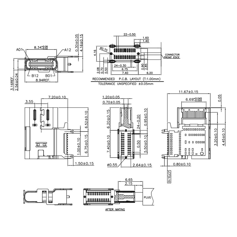 USB Type-C 24Pin Side-mounted female connector, housing: upper spring and lower ribs, with suction position CH 7.20mm