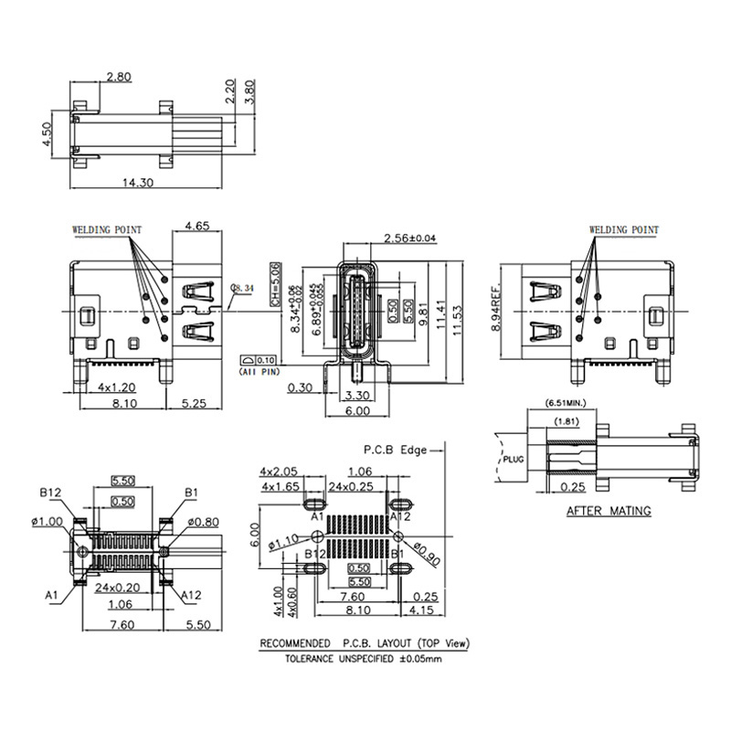 USB Type-C 24Pin Side-mounted female connector, spring-loaded housing CH 5.06mm